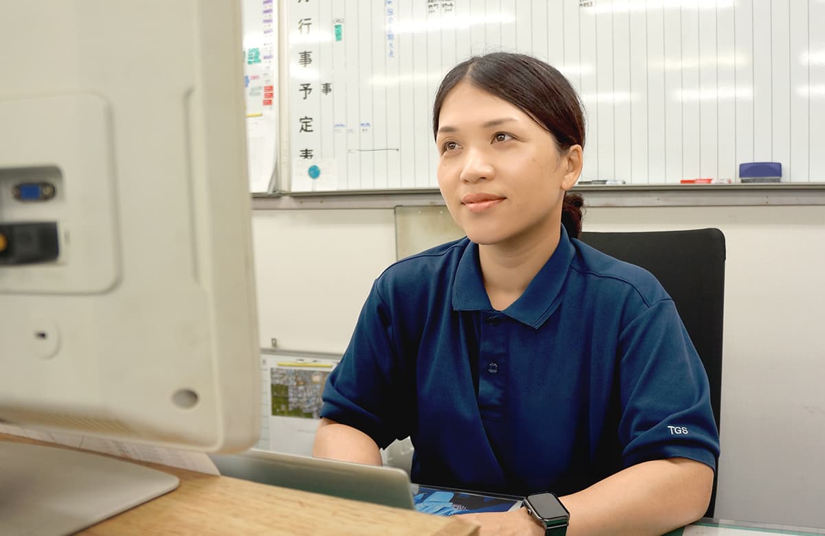 親会社が生産した繊維機械を円滑に工場から出荷し、国内ユーザーや輸出港へ搬入するまでの幅広い事務全般を担当しています。私の仕事は「物流事務」と呼ばれ、一般的事務のほかに、入庫・出荷リストの作成、商品データの入力、配送伝票作成、ドライバーとのやりとりといった事務作業があります。